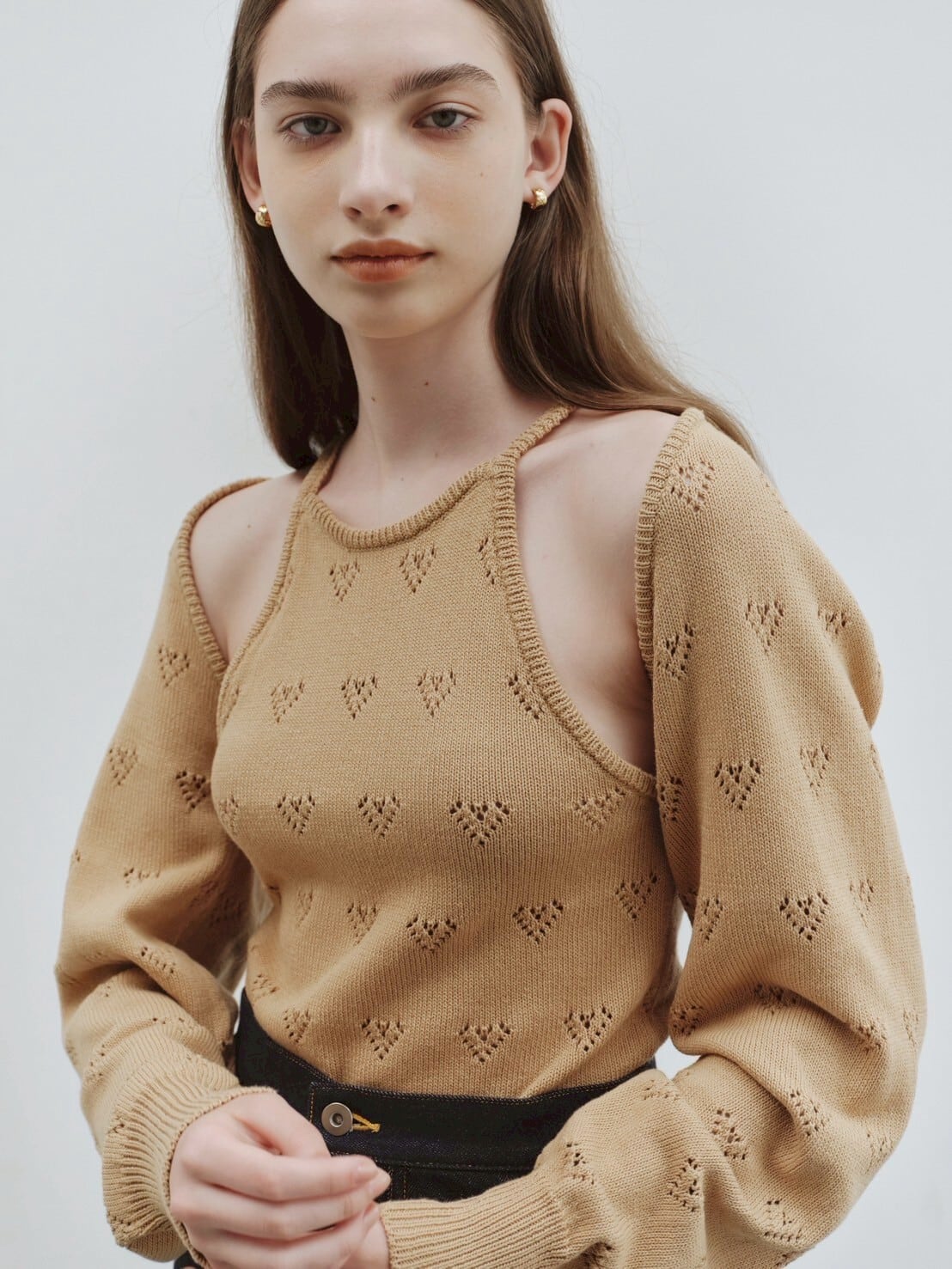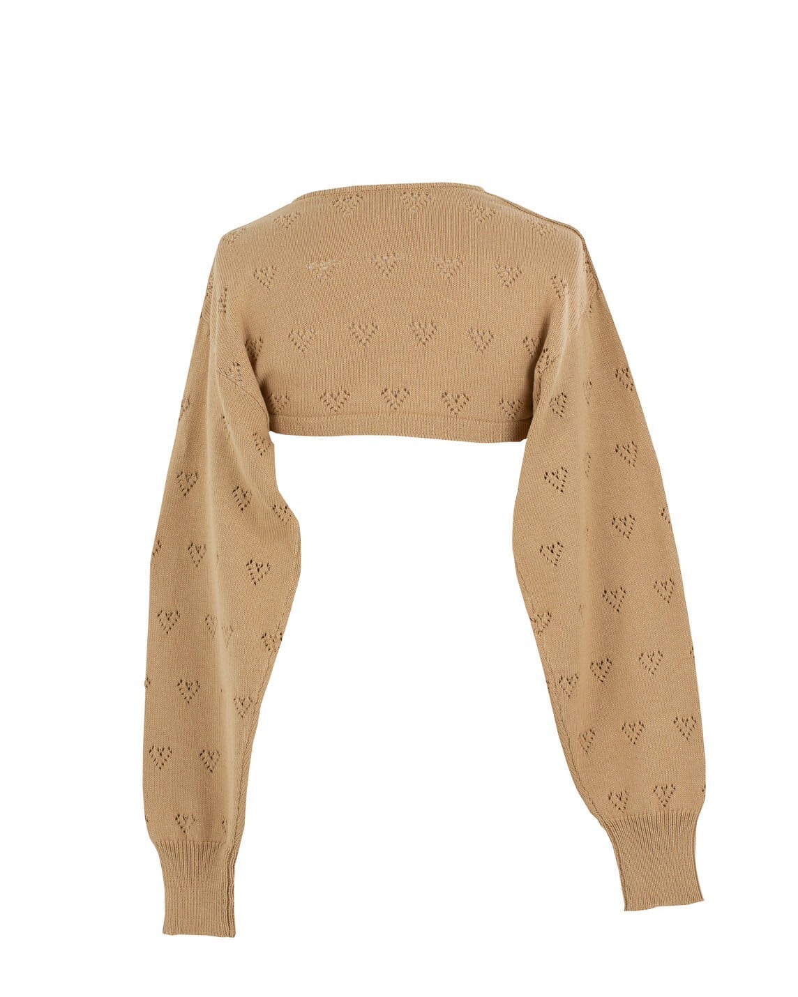 ほんのり甘さを添える、ハート柄の透かし編みニットボレロ。