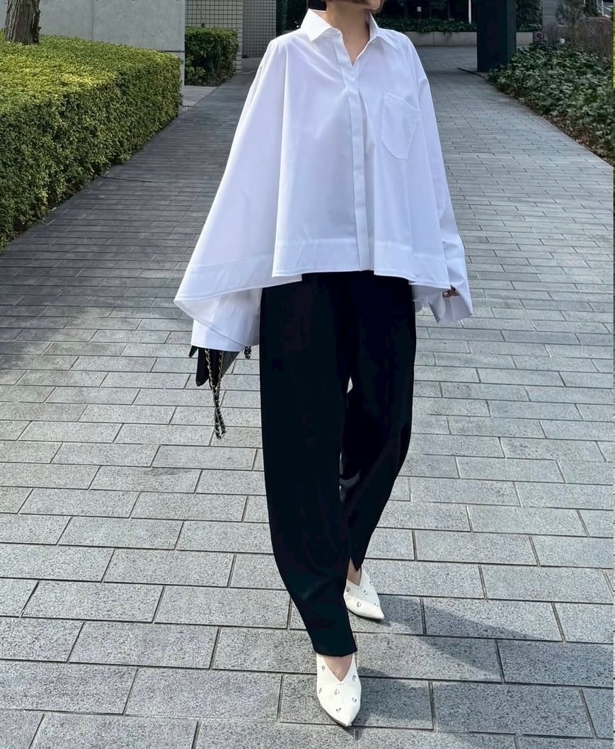 素材には、ウール100%の上質な平織生地を使用。薄手でさらっとした肌ざわりが心地よく、春夏でも快適。平織特有の適度なハリ感と、ウールならではの美しいドレープ感が共存した絶妙なバランスが魅力です。