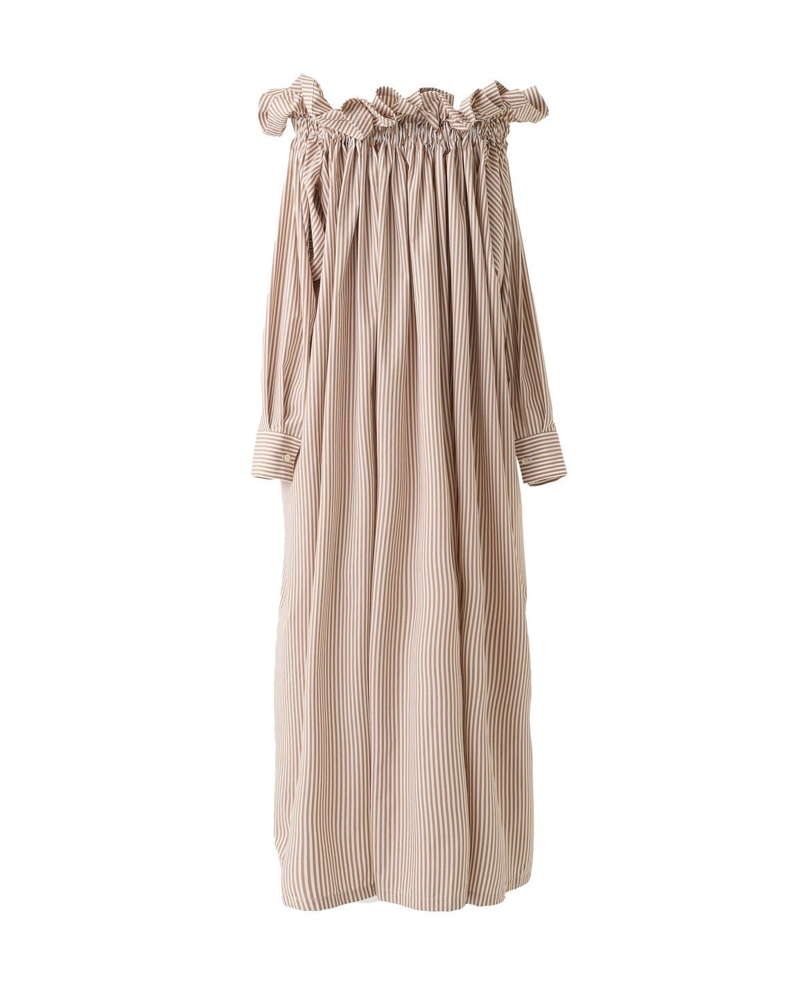 首元を美しく見せるオフショルデザインに、たっぷりと寄せたギャザーと立体的なフリルがロマンティックなムードを添えます。ストライプ柄が甘さをほどよく引き締め、洗練された印象に。