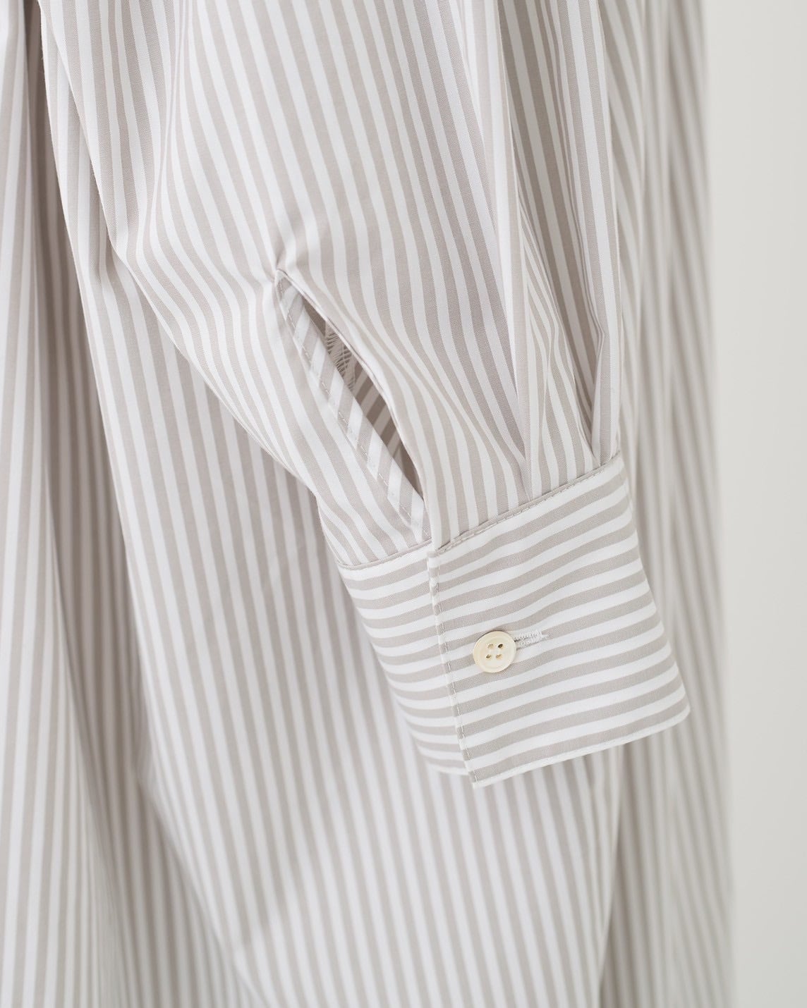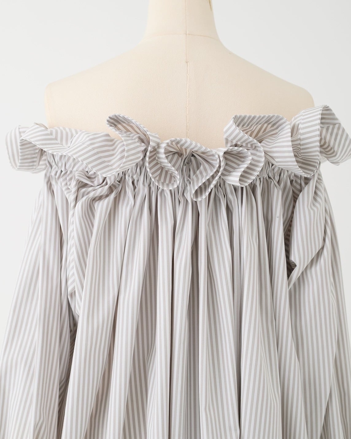 首元を美しく見せるオフショルデザインに、たっぷりと寄せたギャザーと立体的なフリルがロマンティックなムードを添えます。ストライプ柄が甘さをほどよく引き締め、洗練された印象に。