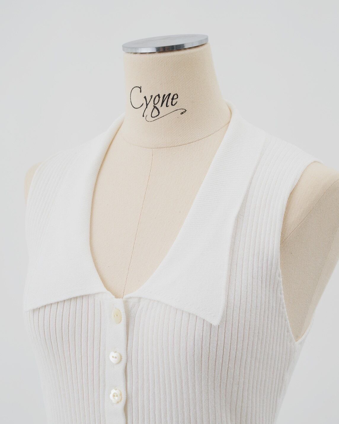 襟付きのデザインが程よくきちんと感を添える、ノースリーブのリブポロニット。
