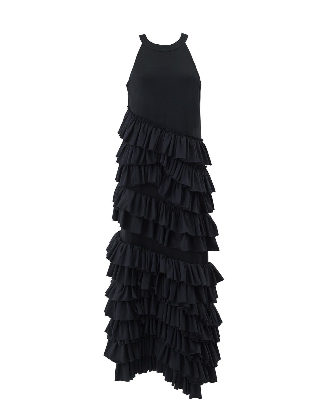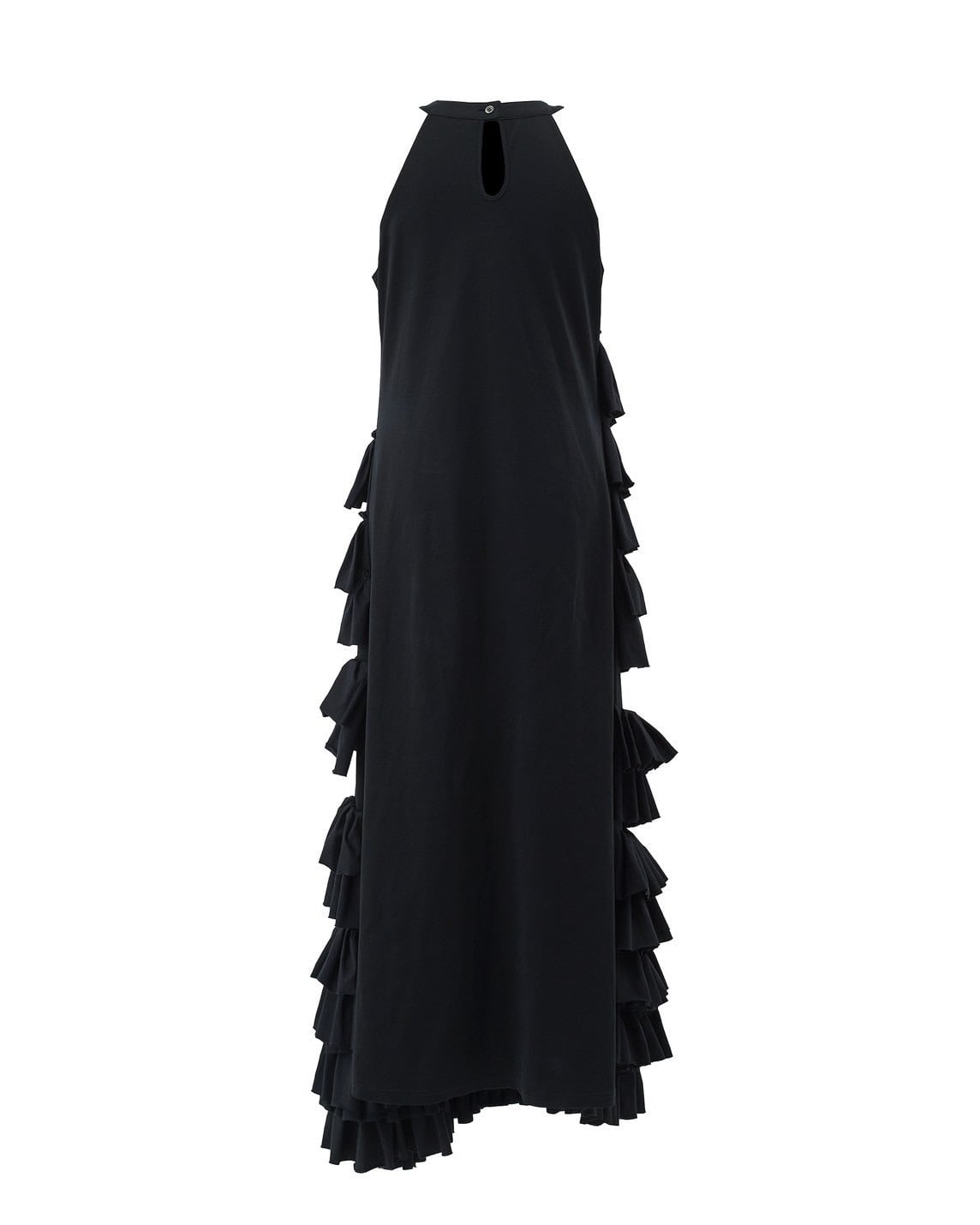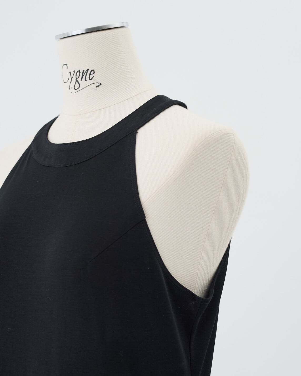 動くたびにふんわりと揺れる繊細なラッフルが、華やかさと女性らしさを演出。すっきりとしたアメスリのシルエットが肩まわりを美しく引き立て、全体をモダンな印象に仕上げます。