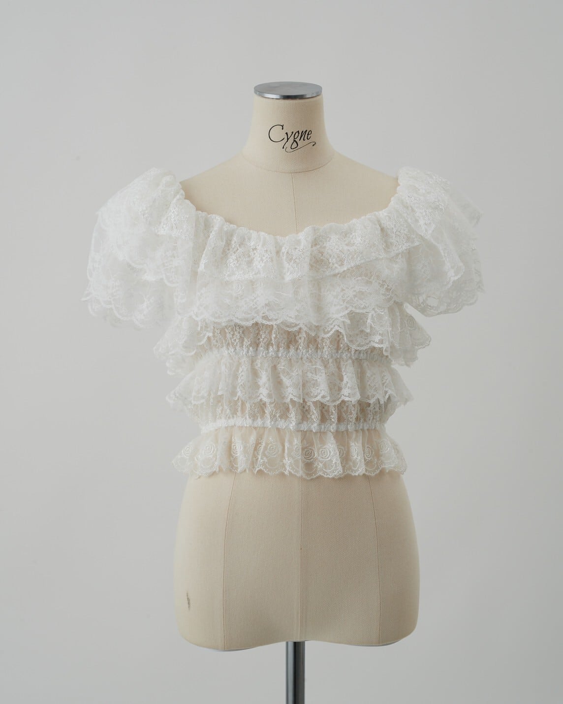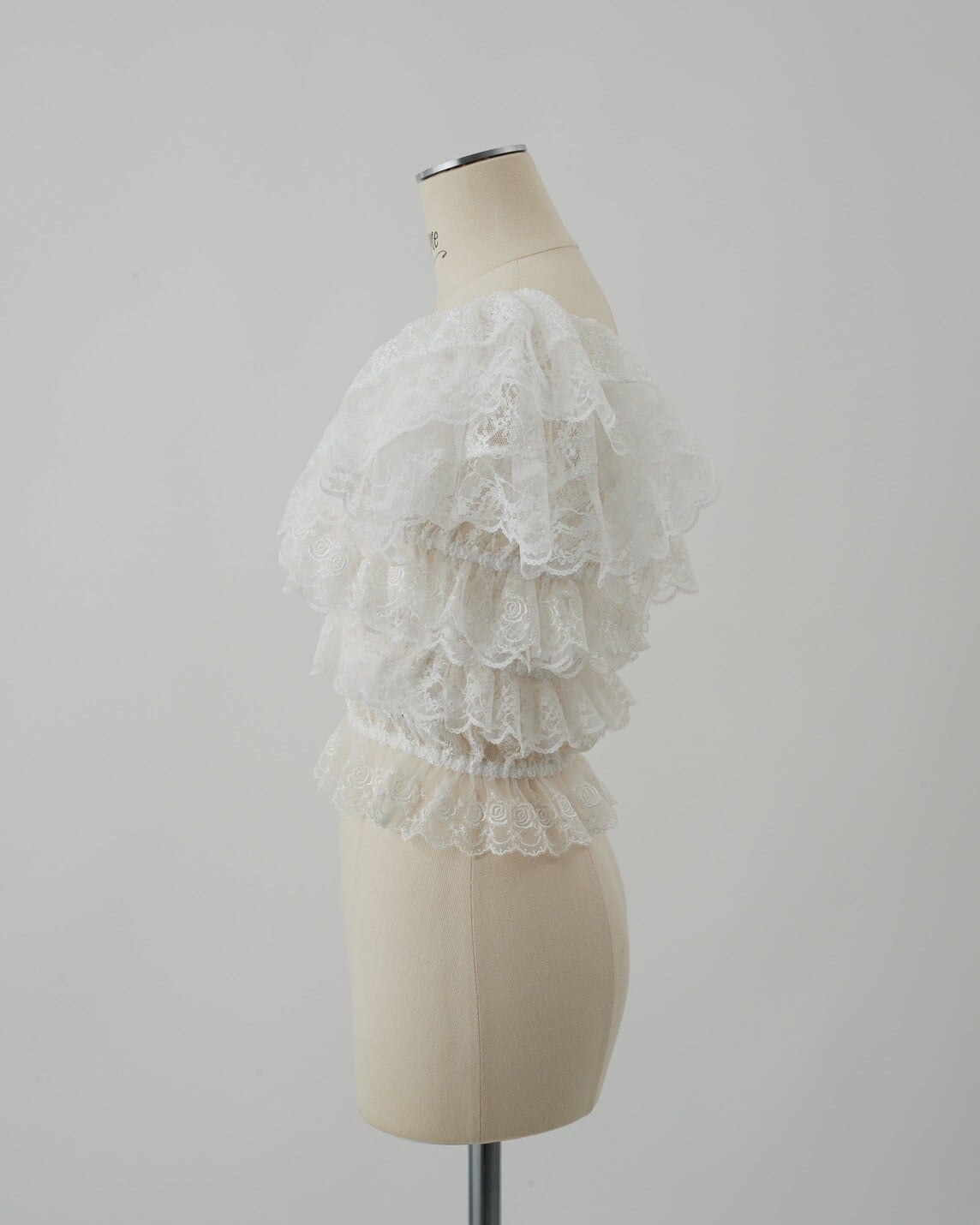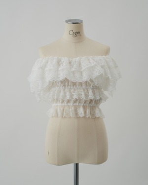 デコルテを美しく引き立てるオフショルダーデザインのレーストップス。