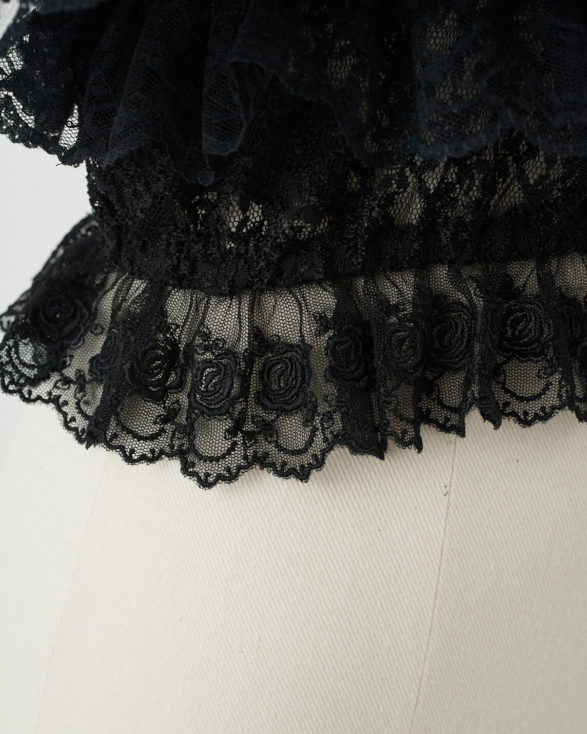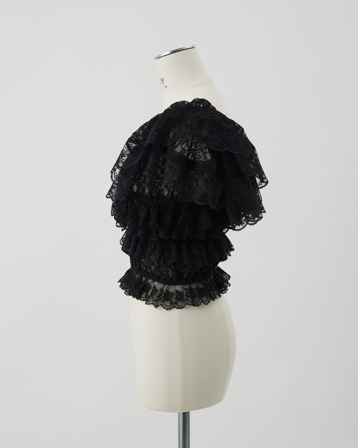 贅沢にあしらったレースが華やかな存在感を放ち、ふんわりとしたボリューム感がフェミニンな印象を添えます。