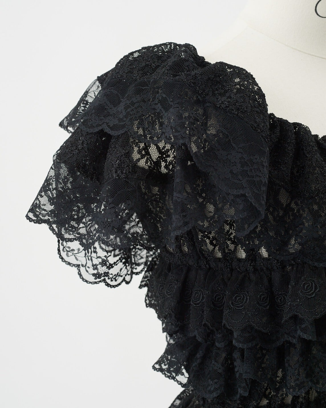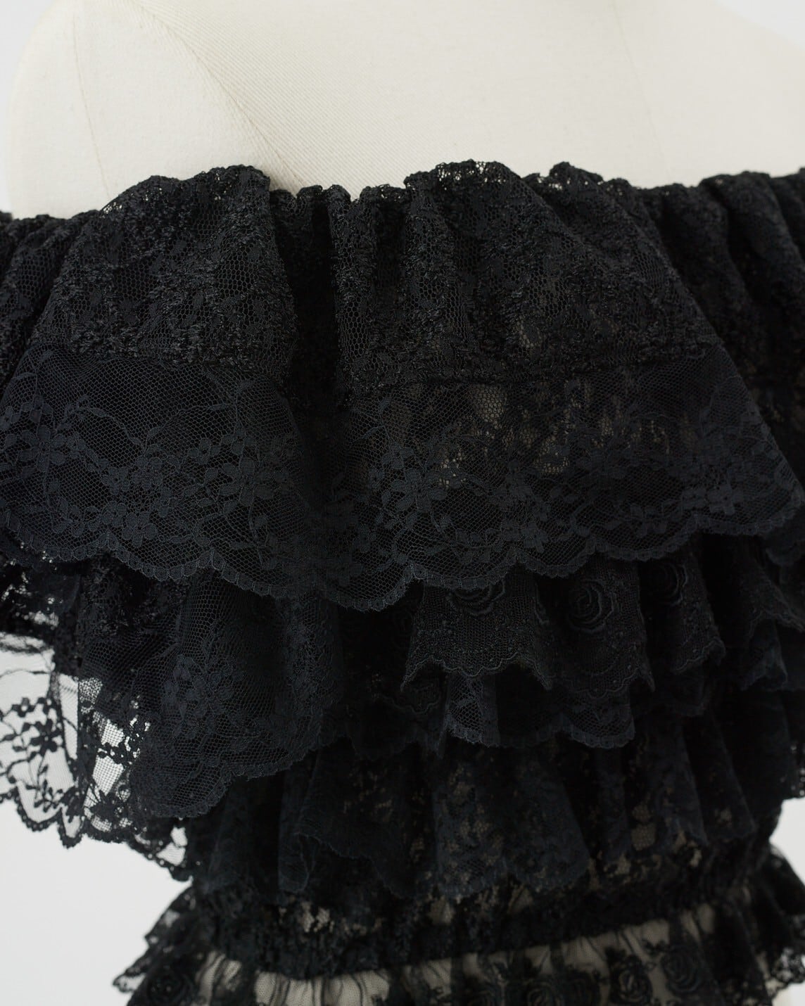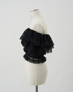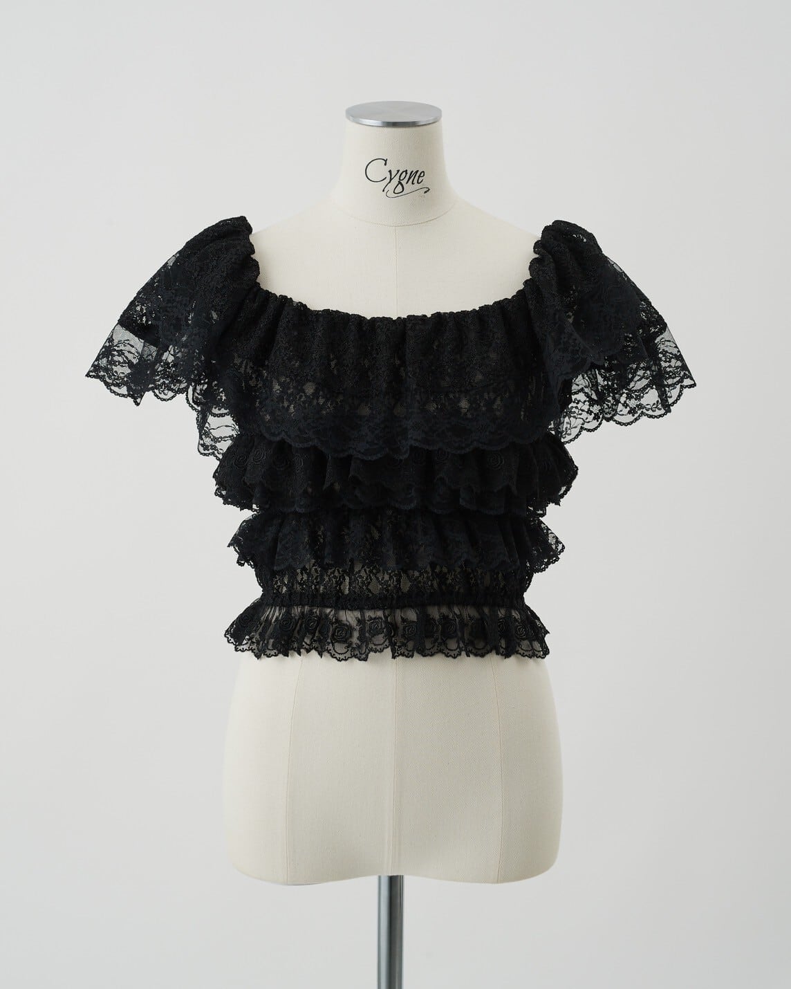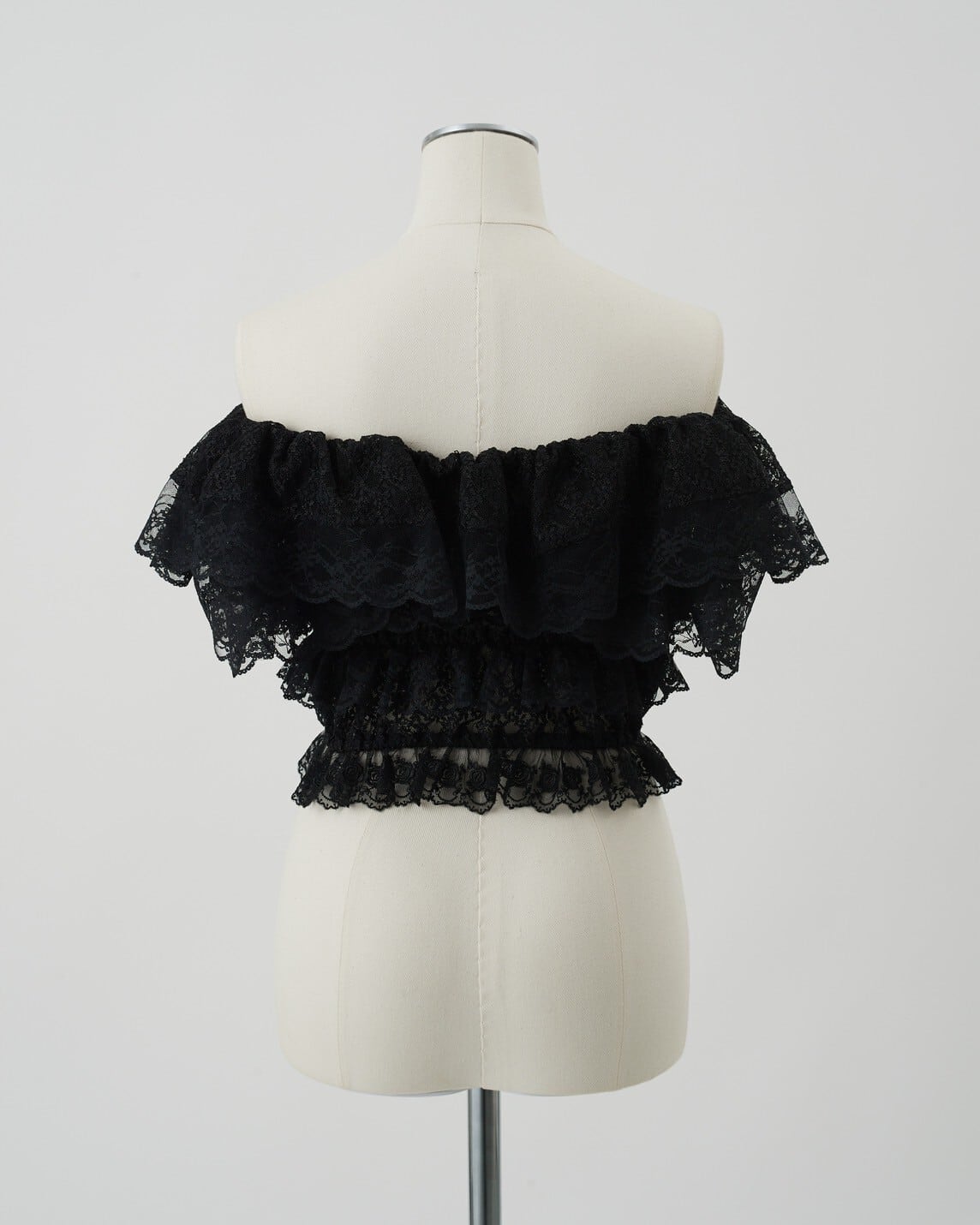 デコルテを美しく引き立てるオフショルダーデザインのレーストップス。