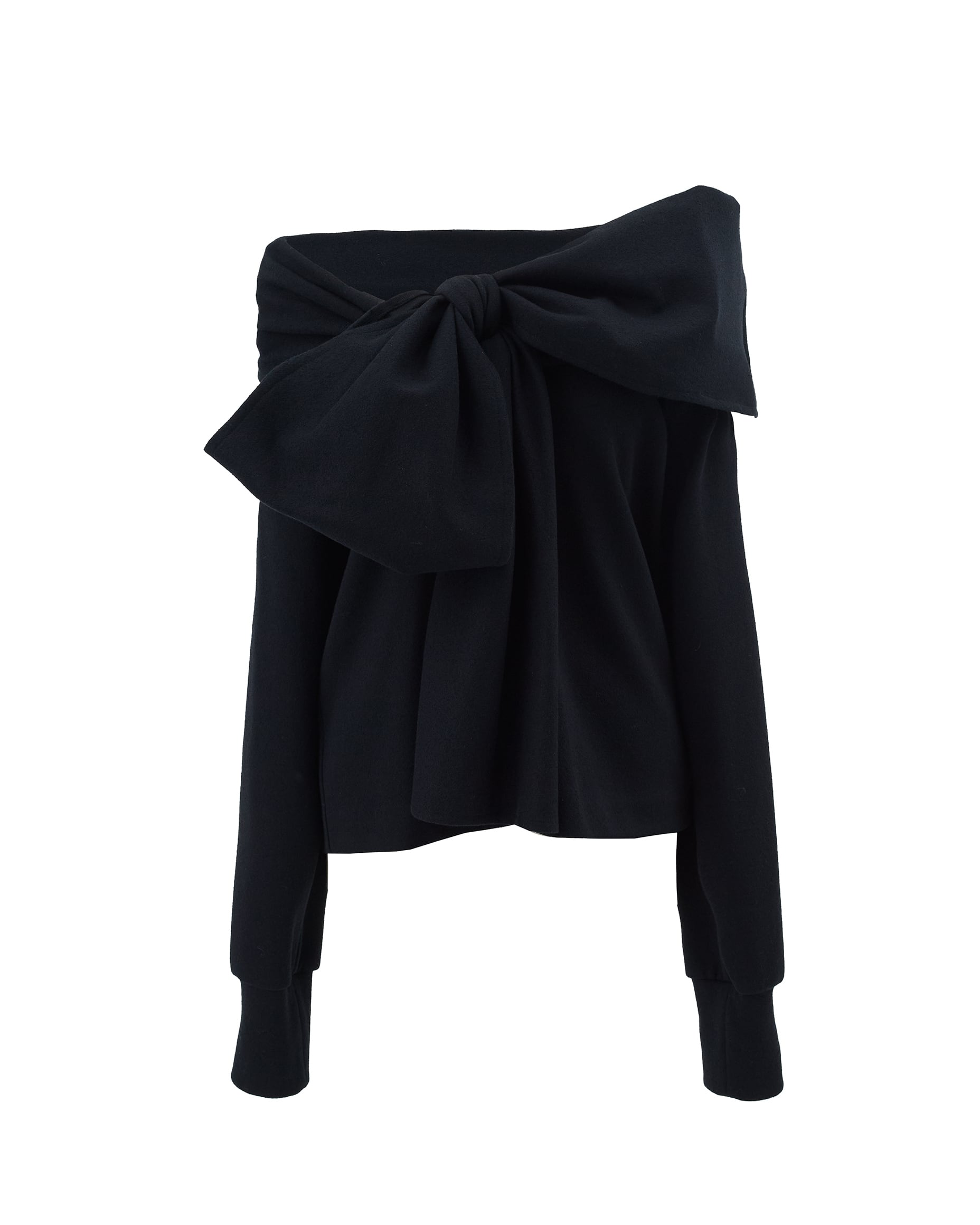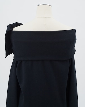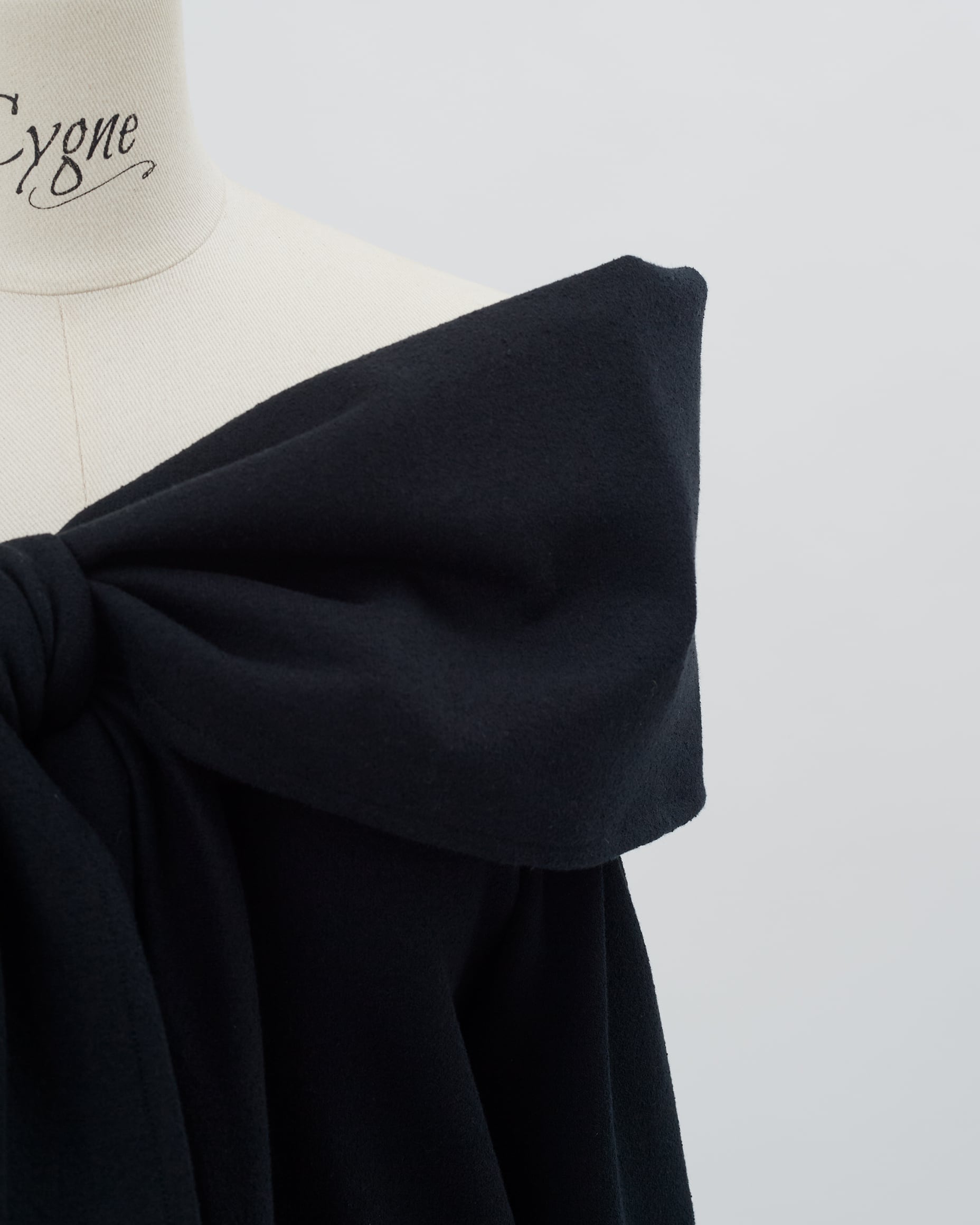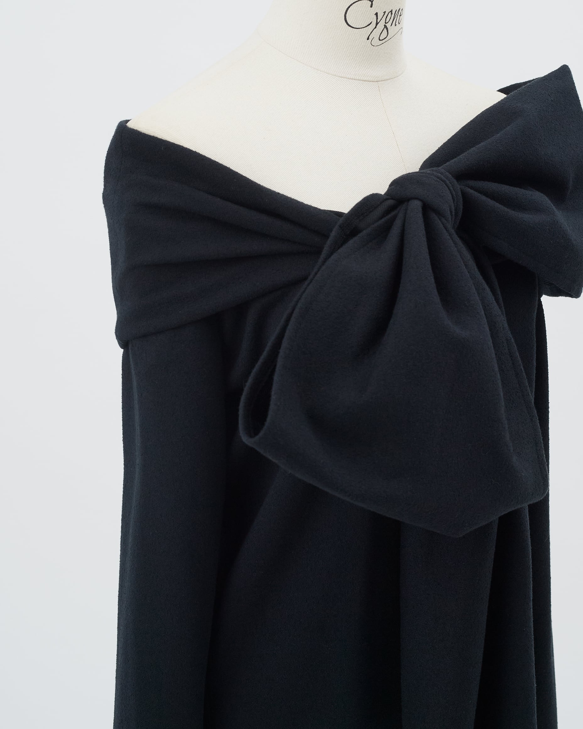 立体的なリボンの華やかさと、デコルテラインを美しく見せてくれる1着。