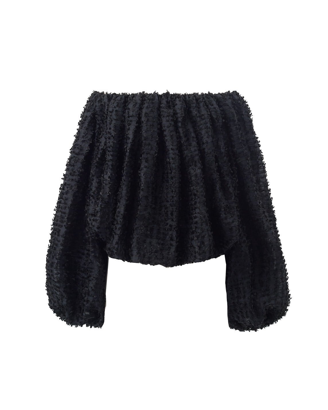 たっぷりとギャザーを寄せたボリュームスリーブが印象的なオフショルダーブラウス。