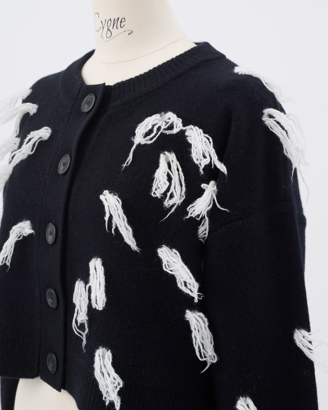 もけもけとした立体的なモチーフが目を惹くニットカーディガン。