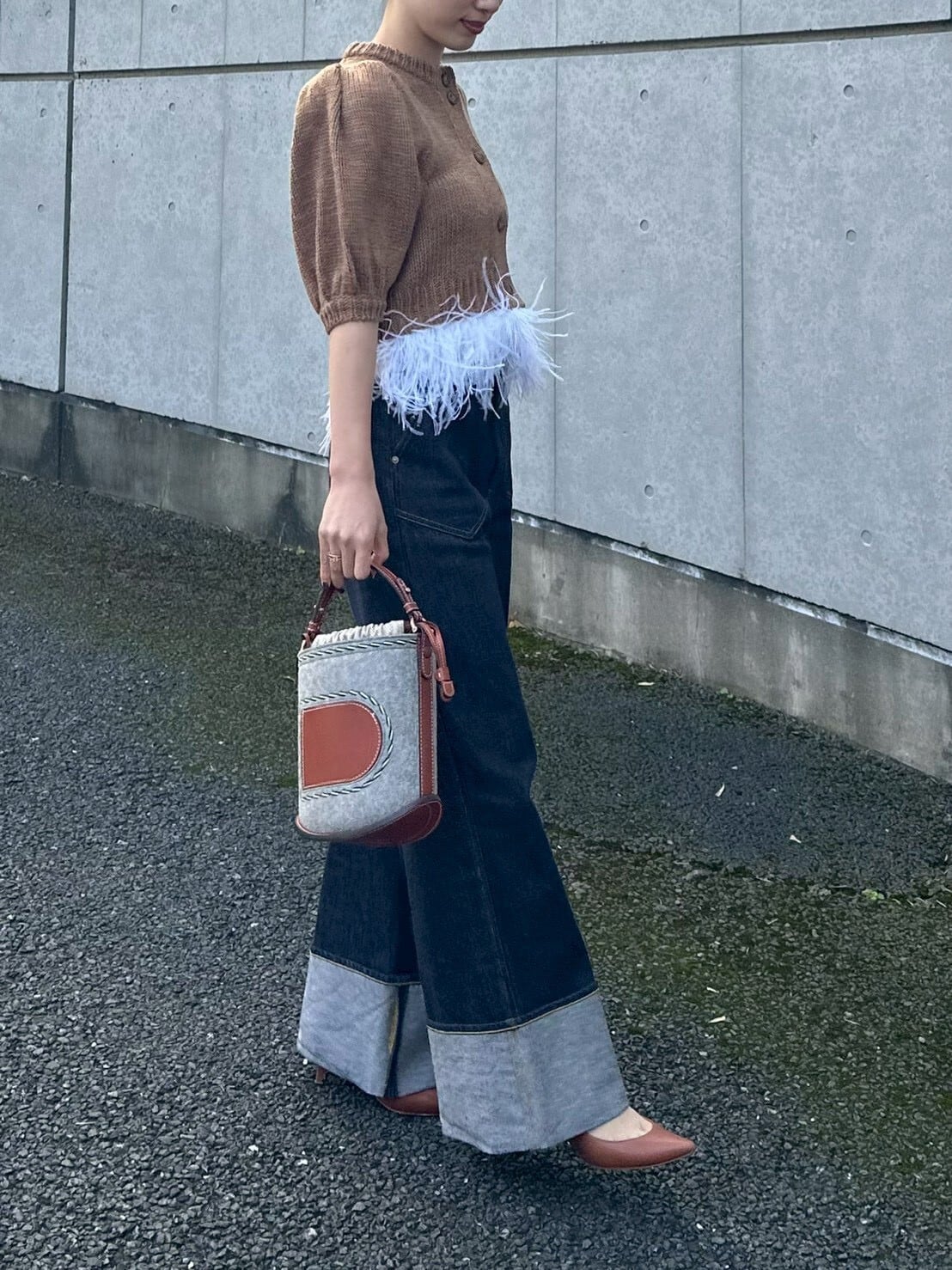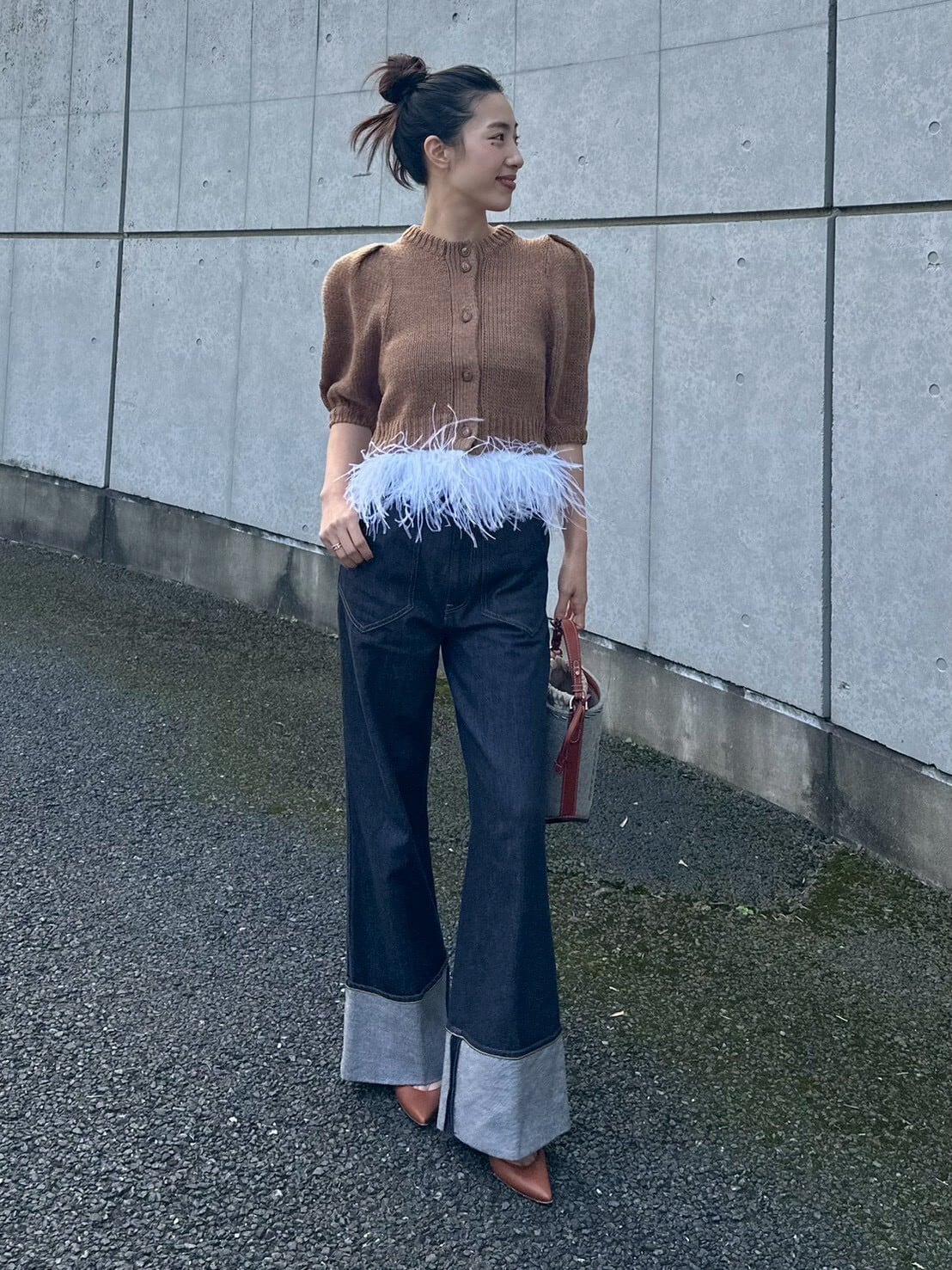 ボリュームのあるパフスリーブと、裾にあしらわれたフェザーのディテールが動くたびに軽やかに揺れ、上品で華やかな印象を演出します。