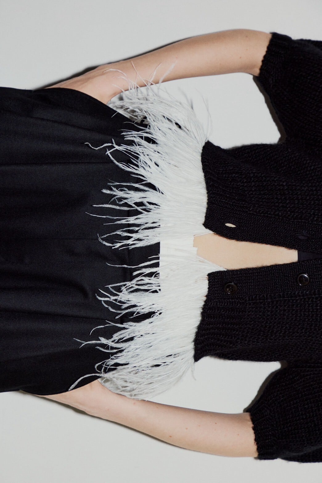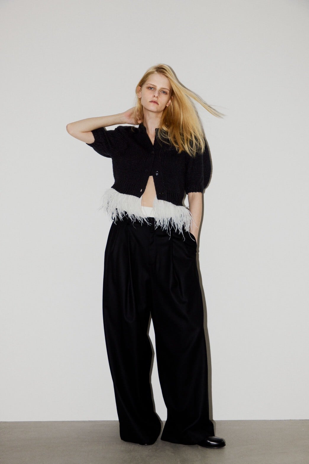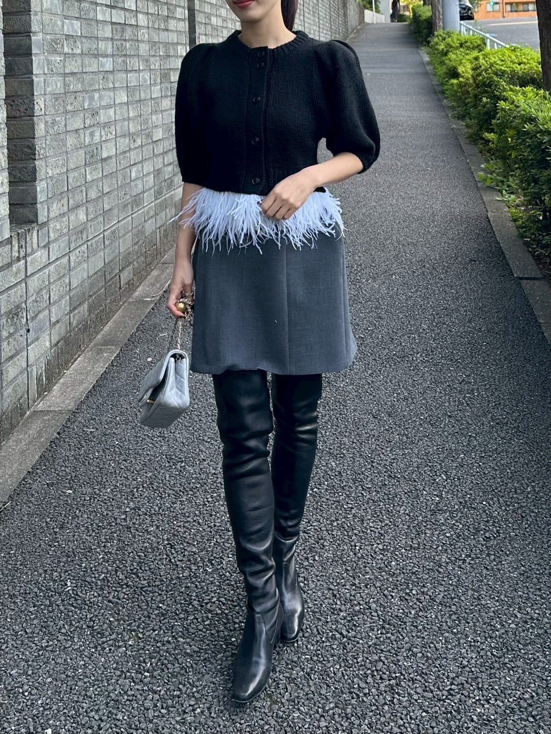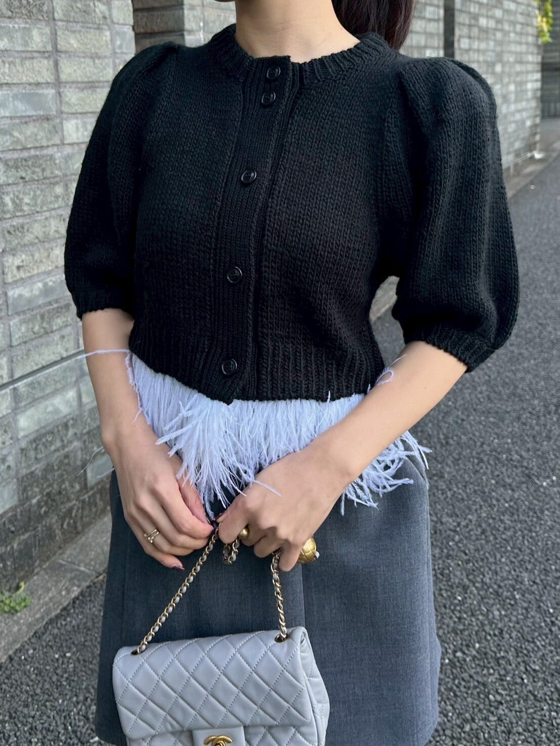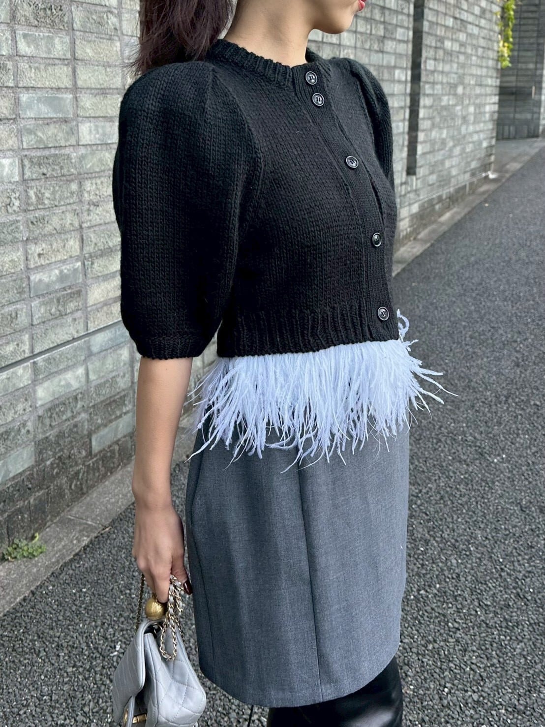 ボリュームのあるパフスリーブと、裾にあしらわれたフェザーのディテールが動くたびに軽やかに揺れ、上品で華やかな印象を演出します。