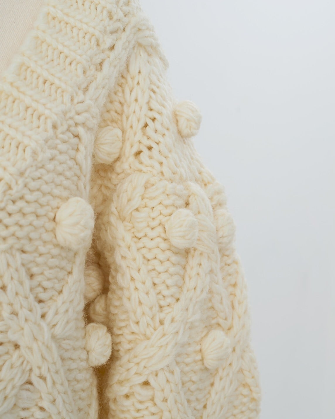 丸いポンポンが特徴の温もり溢れるモヘアカーディガン。