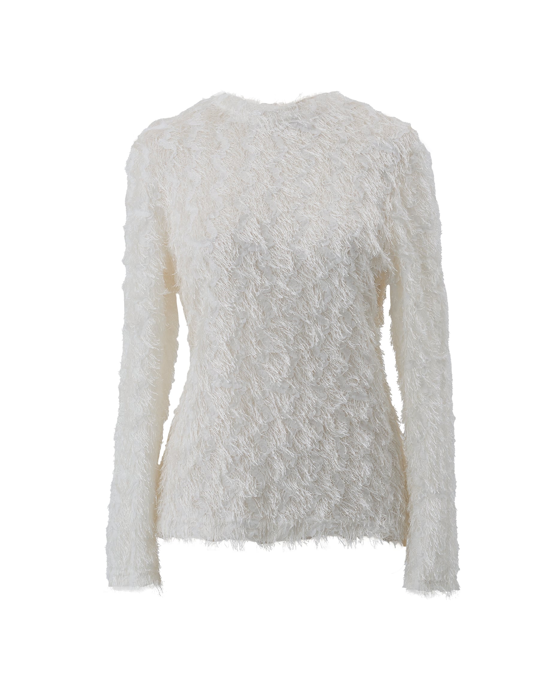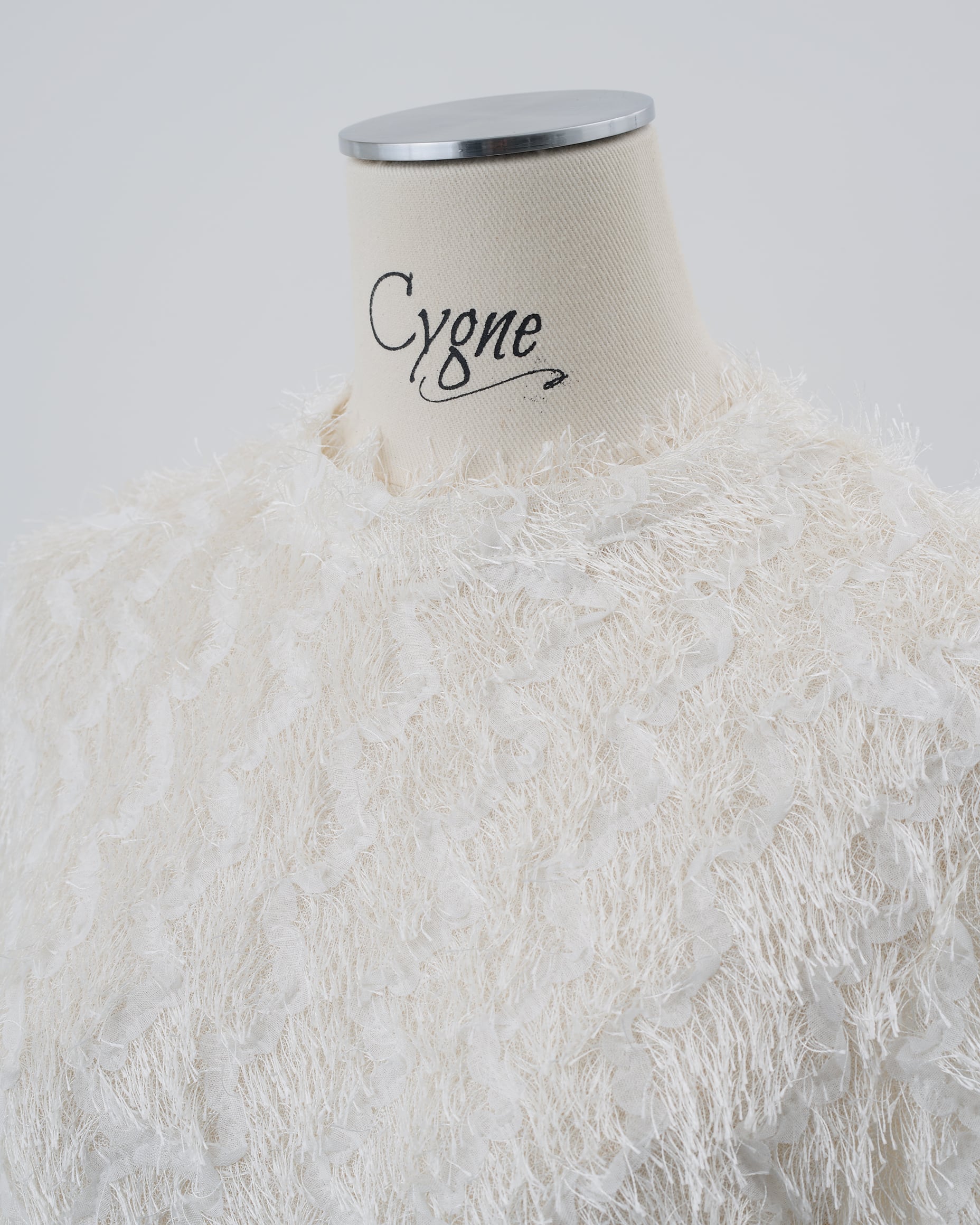素材そのものの表情感がスタイリングを一瞬で華やかにしてくれる、ファンシートップス。