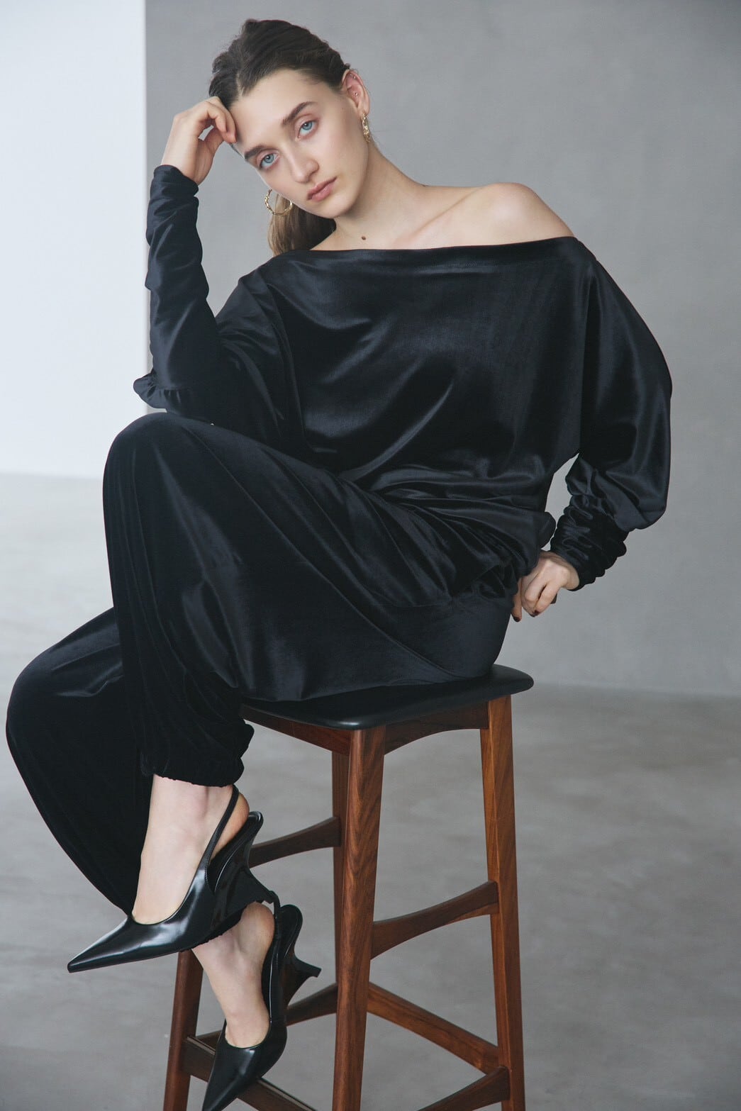 同素材のベロアパンツとのセットアップスタイルもおすすめ。