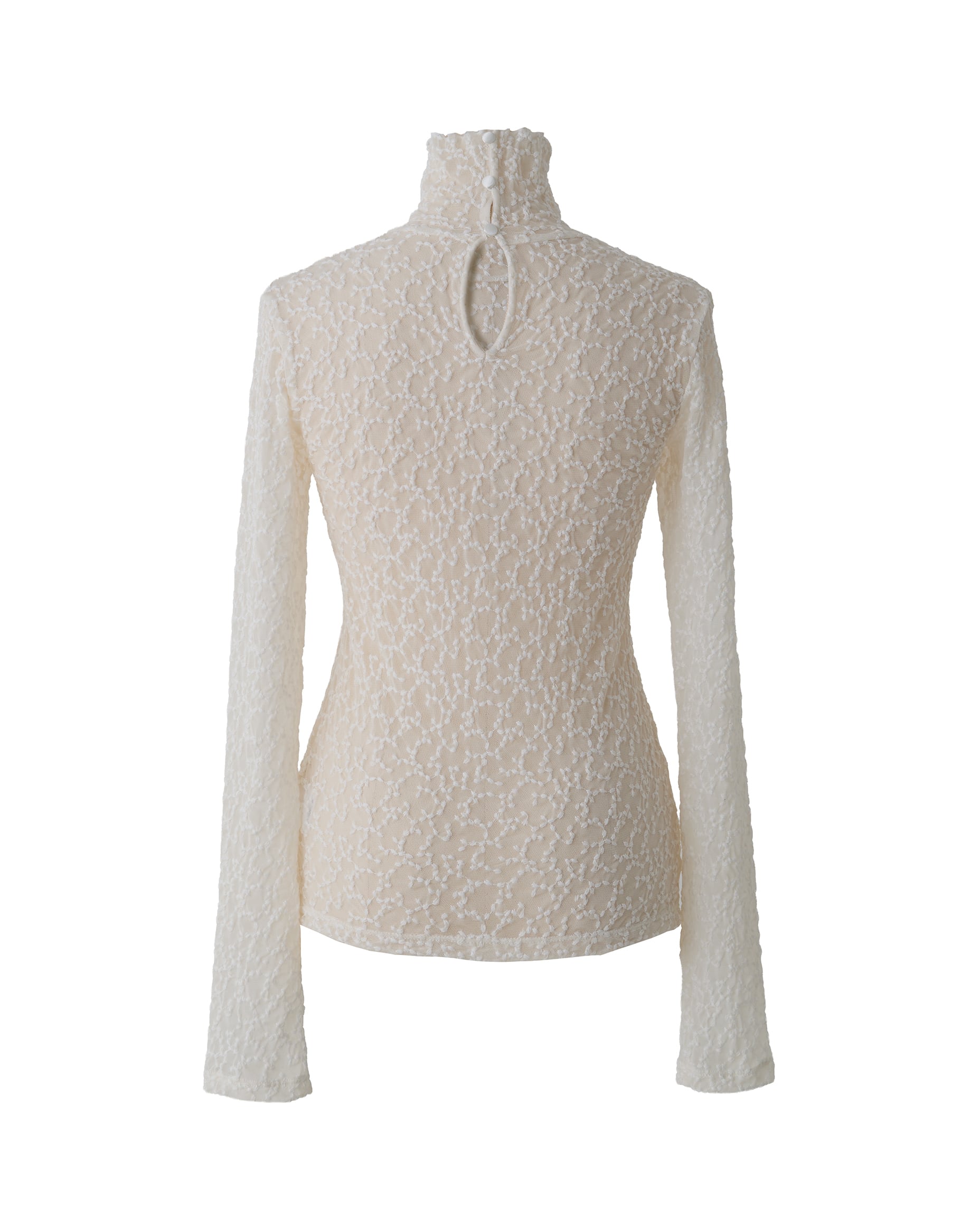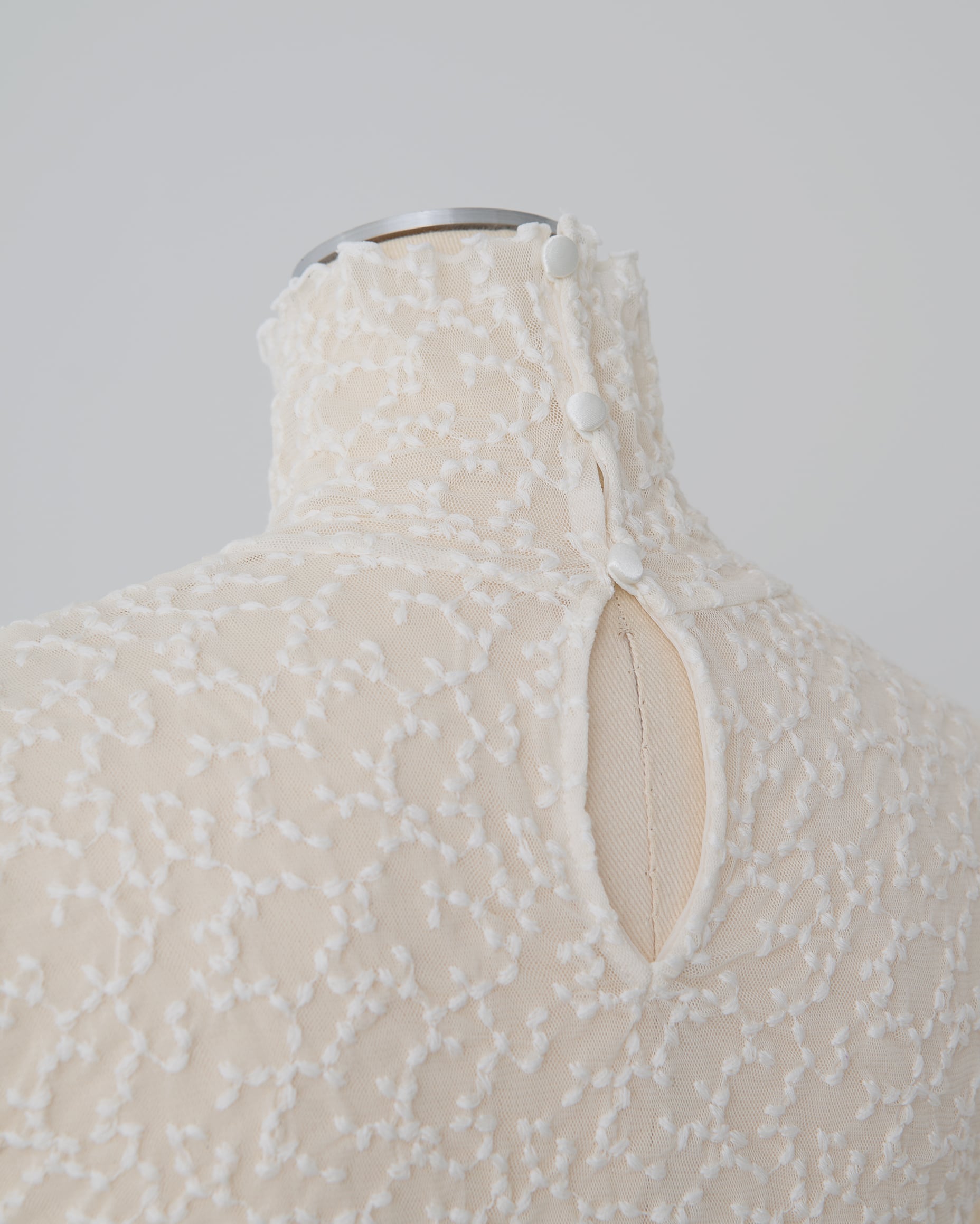 前からはハイネックで上品に、後ろ姿は女性らしい印象にみせてくれます。