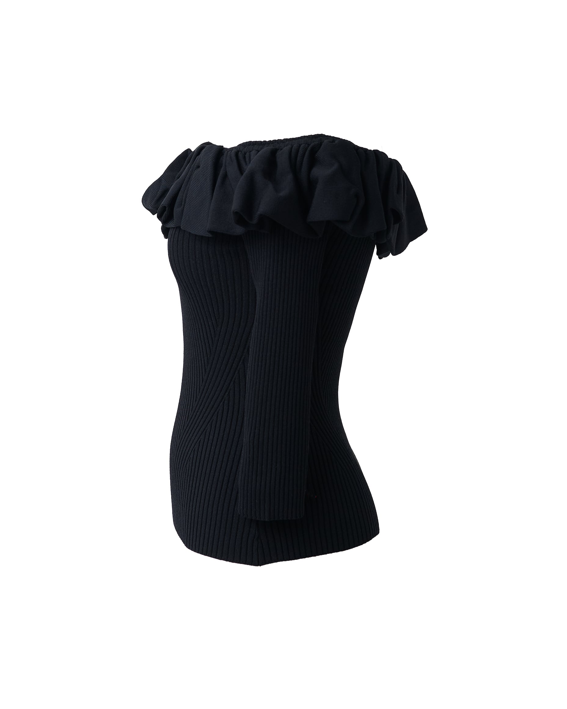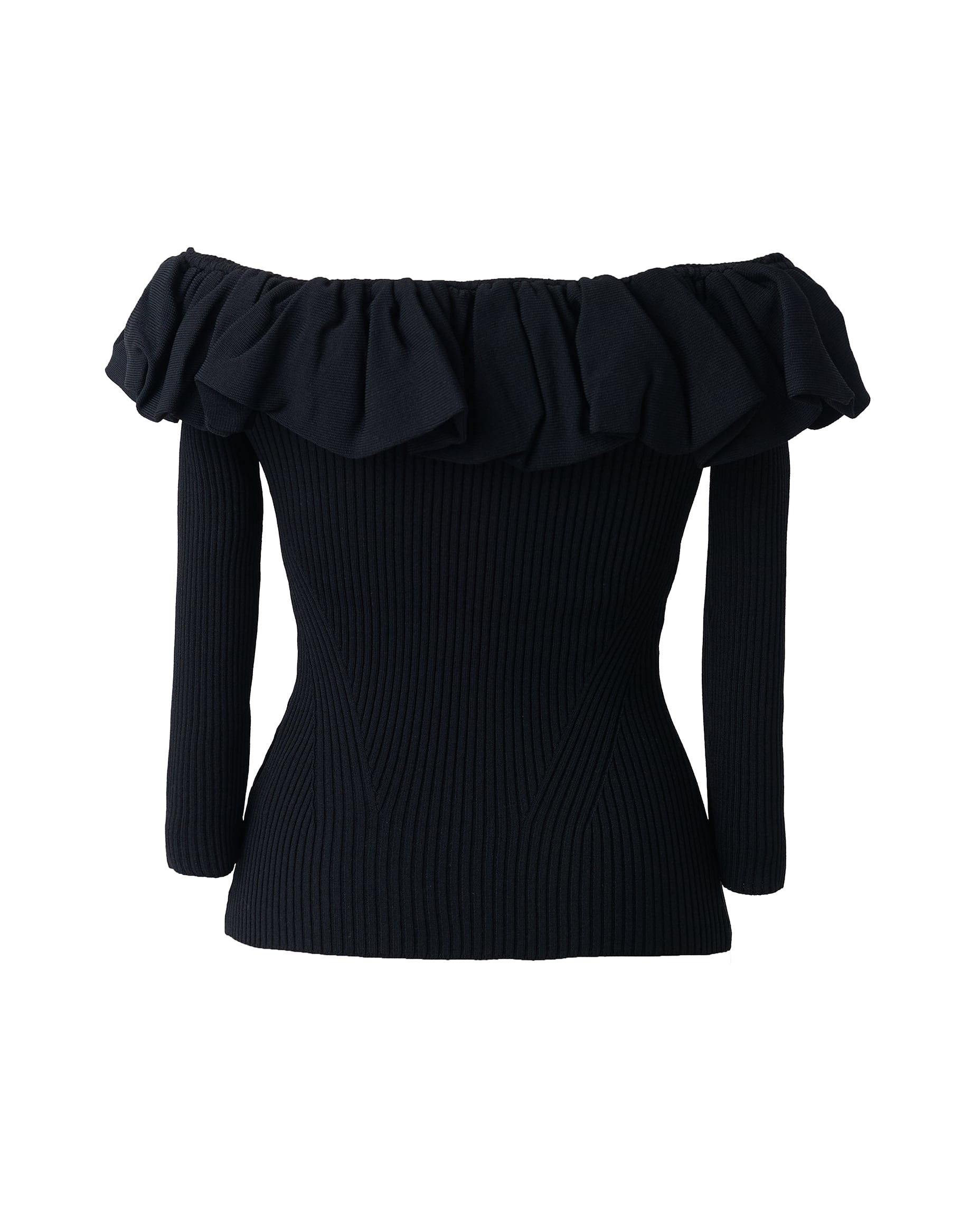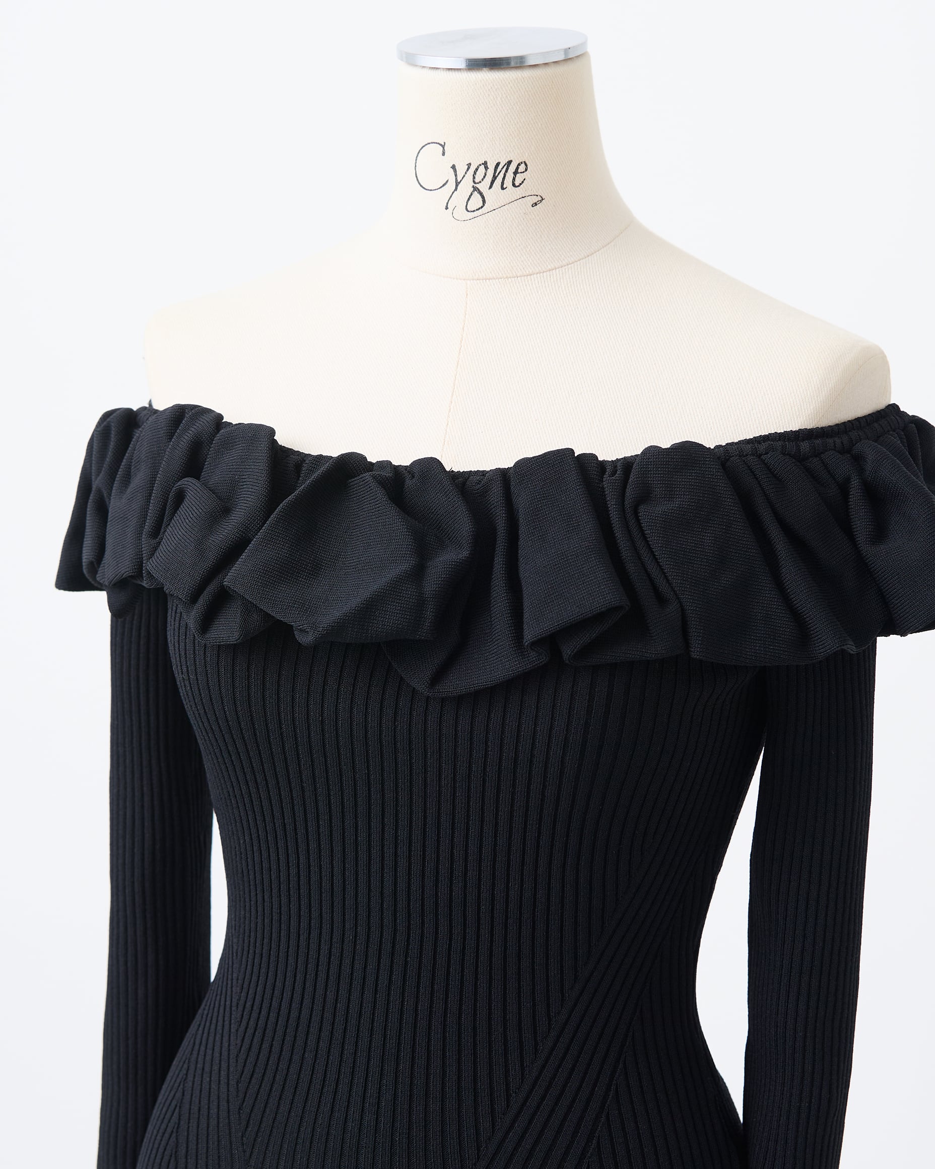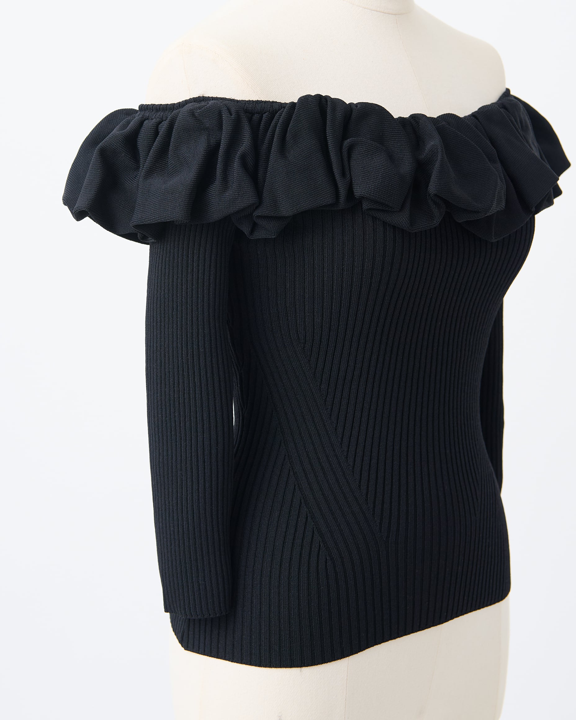 肩まわりにあしらわれたフリルが、スタイリングに華やかなアクセントをプラス。