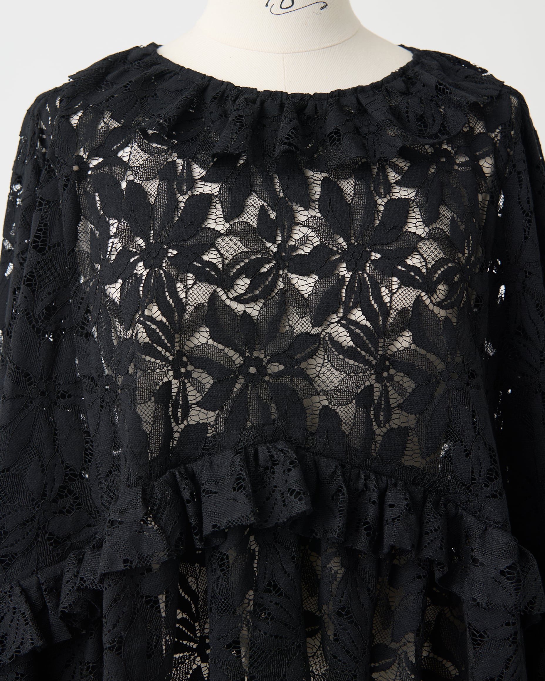立体感のあるレース素材が上品な存在感を放ち、纏うだけでスタイリングを格上げしてくれる一枚です。