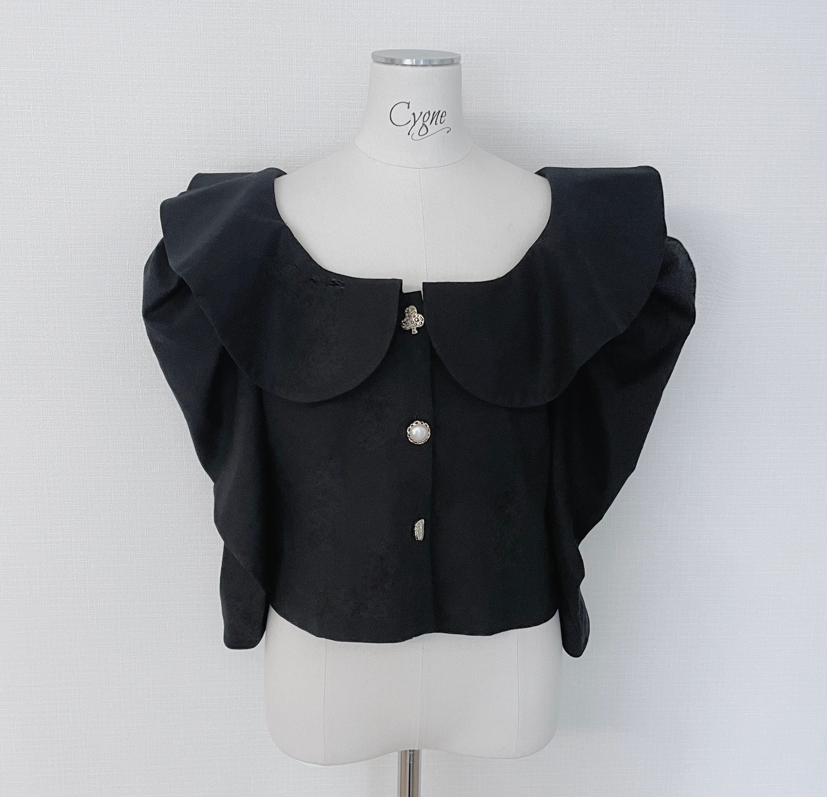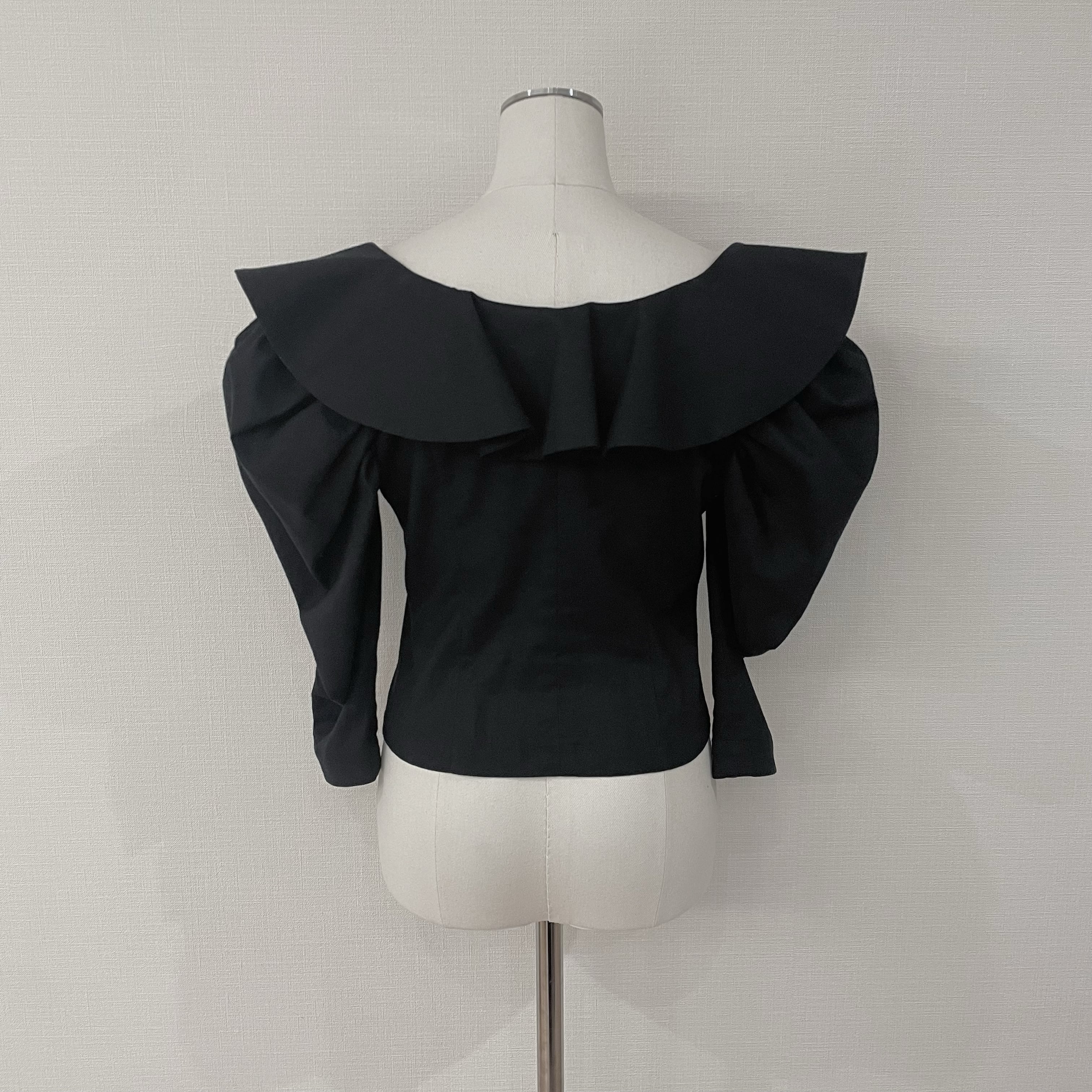 綺麗に開いた胸元とひらひらとした大きな襟。ウエストはシェイプされているのでこちらもスタイルアップブラウスです。