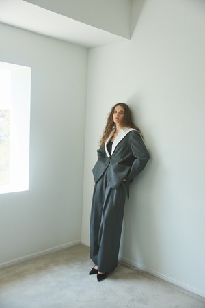 同素材の セーラージャケットRan とセットアップで合わせれば、モード感のある洗練されたスタイルが完成。