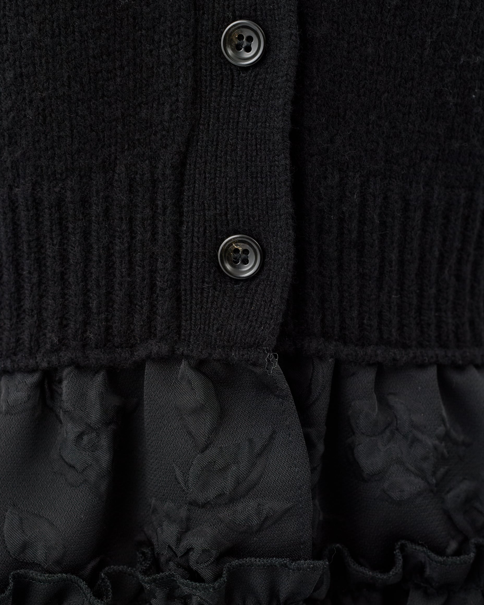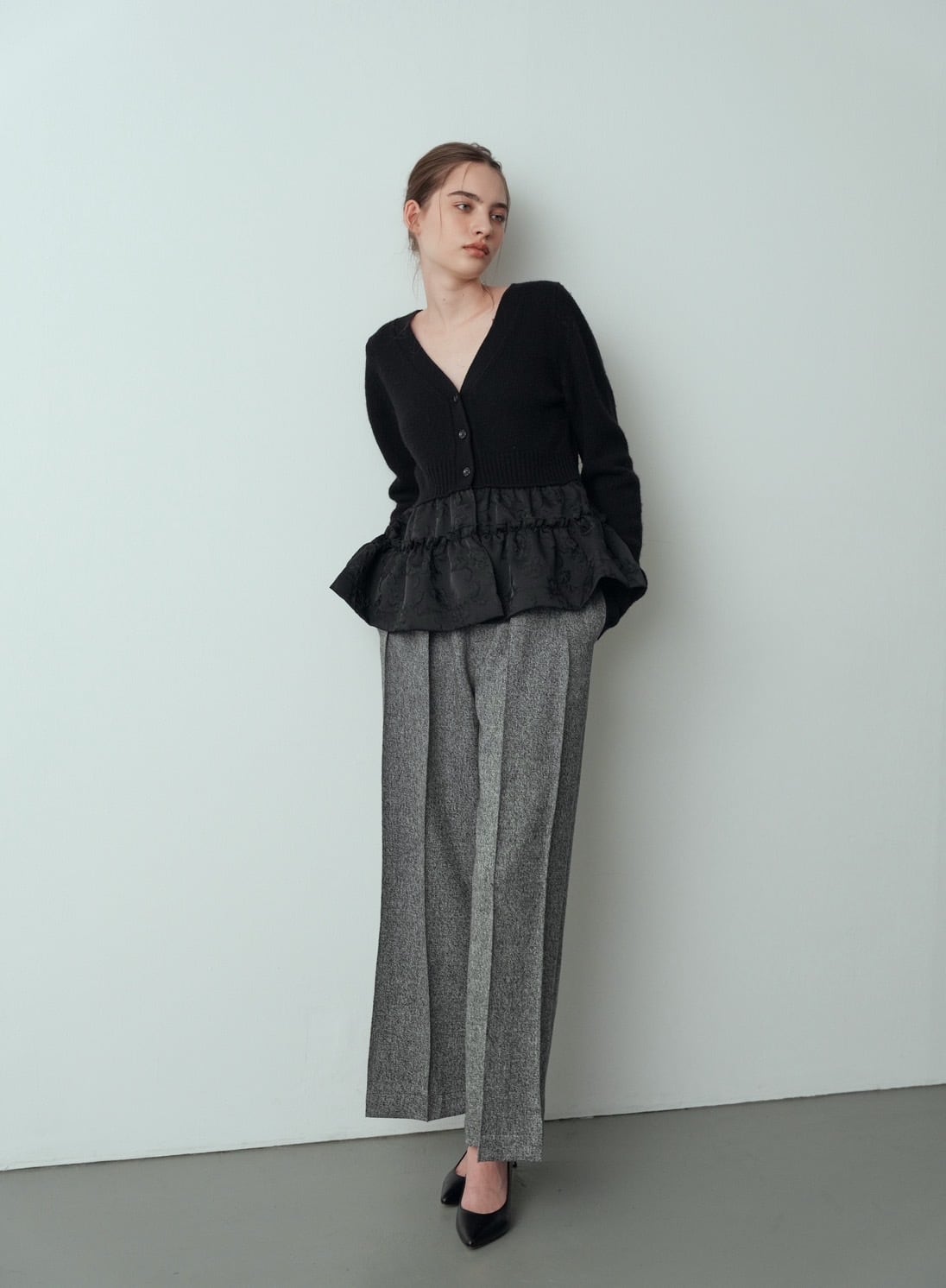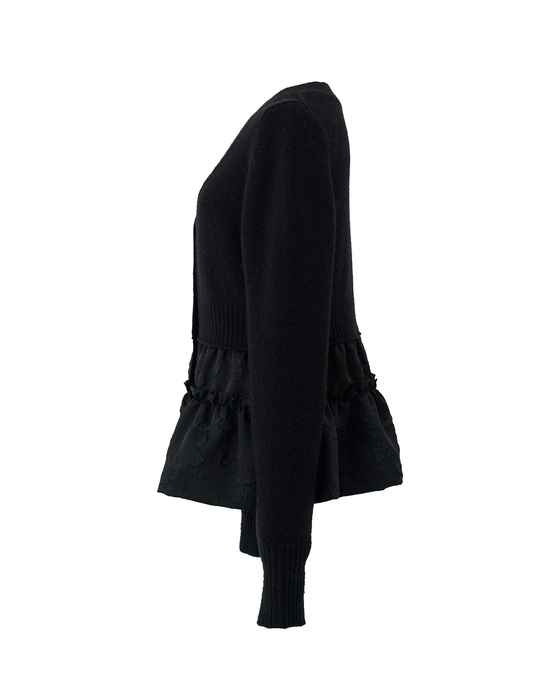 身頃とペプラムが異素材で切り替えられたドッキングカーディガン。