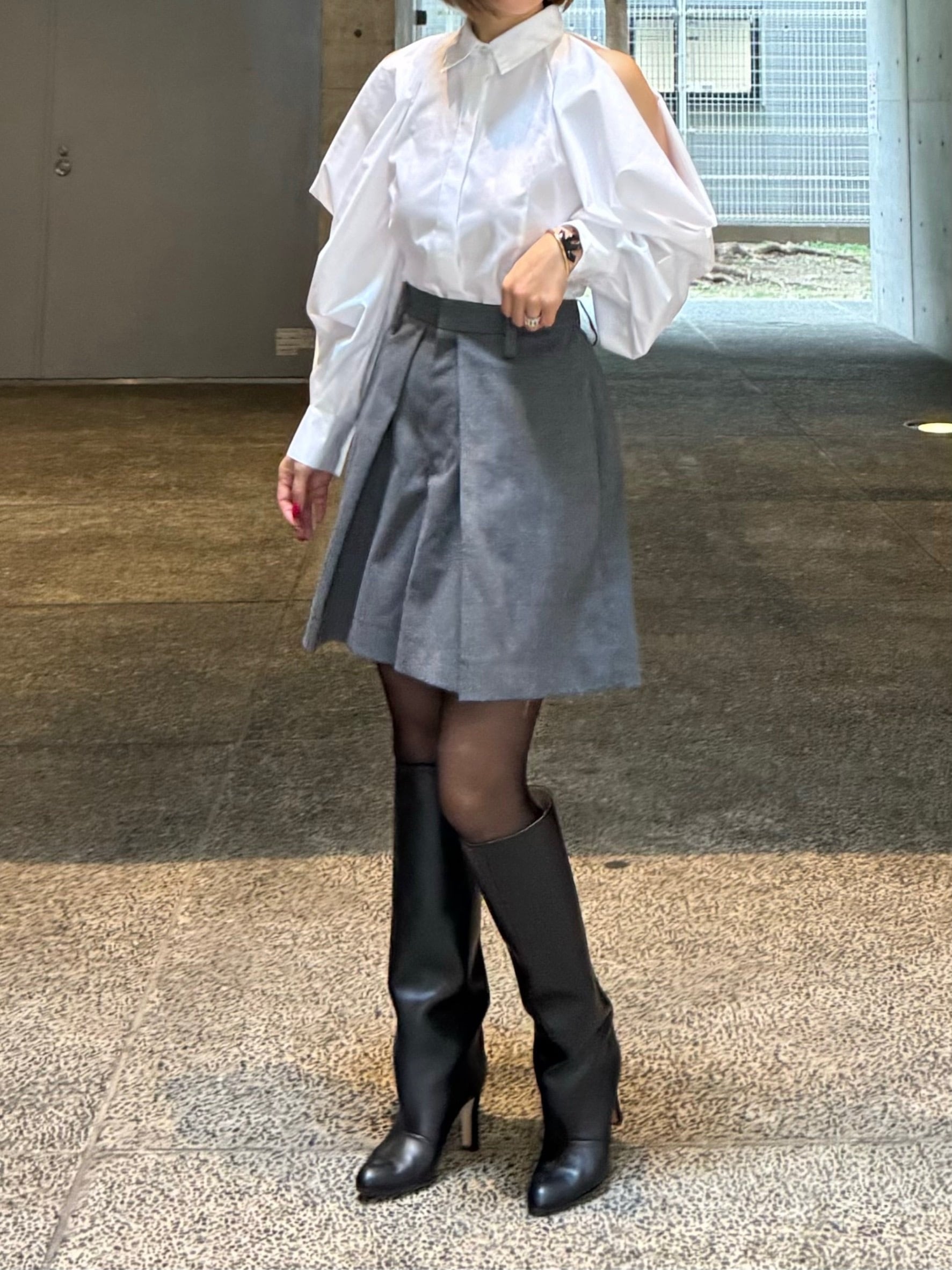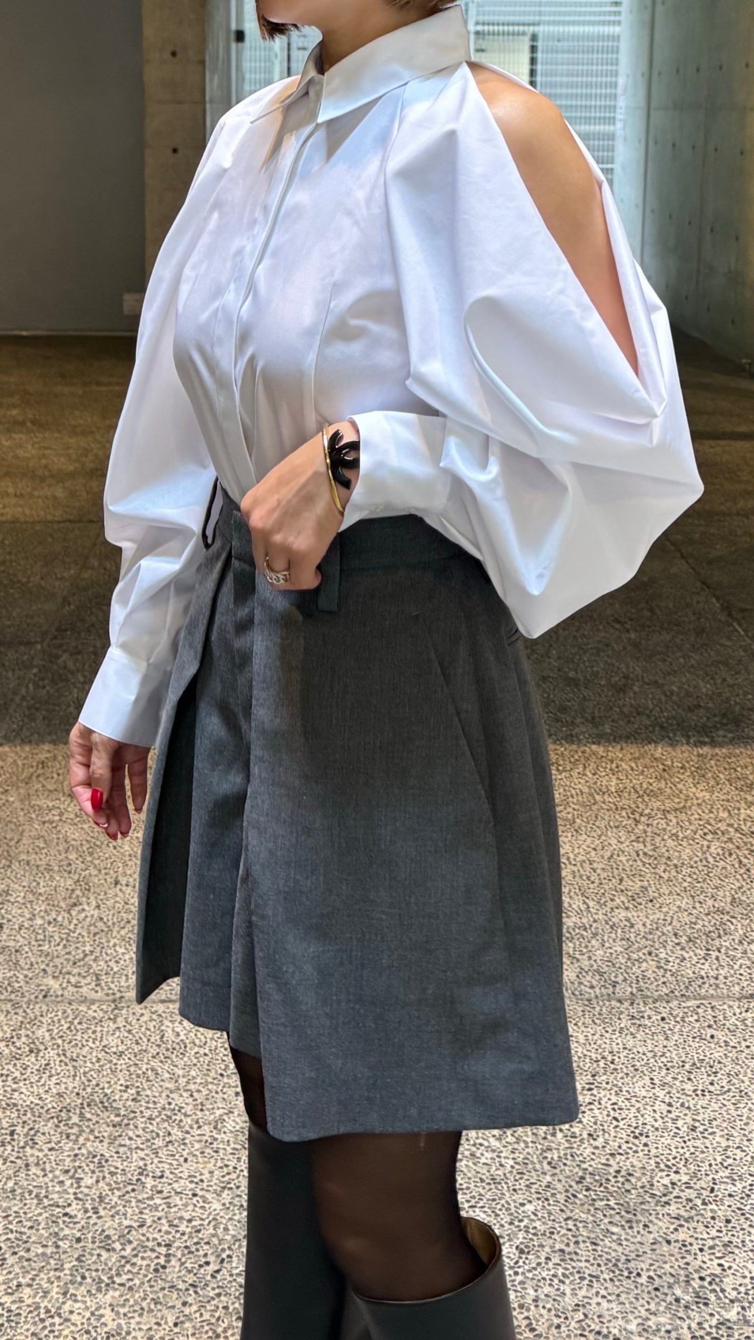 細身の身頃にボリュームのあるお袖がスタイリッシュに見せてくれます。
